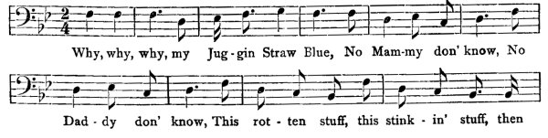 So as this girl was courting by Juggin Straw Blue, his mother was an Old Witch too. And the courtyer's mother waked him up and gave him eight eggs; for the Old Witch man has seven heads and seven eggs, and each egg is for one of the Old Witch head. Well, the boy went after the Old Witch man and overtake him and mash one of the egg, and day light. And he cut off one of the head. An' the Old Witch man mash one of his egg and night came back. An' the boy mash the next one of his, and day light again; an' the Old Witch man mash one of his egg and night come back again. And so they went on that way until the boy mash seven egg and cut off the Old Witch seven heads and take away his girl. And he went home with his girl and marry.