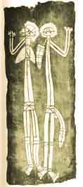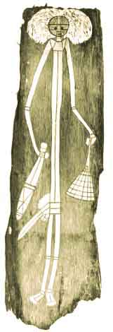 In Fig. 82 [Bark Drawing: a Mormo, Called Yerobeiri, (Kakadu Tribe)] two spirits belonging to the Geimbio country, but called Yerobeni by the Kakadu people, are drawn. Some of these are women, others are men. They are supposed to live in caves and holes in the ground, or in banyan trees in the jungle, where they sleep at night time, only coming out during the daytime, when they dance about under the tree graves but do not interfere with the bodies. The woman on the left side is drawn with her head in profile showing the long-drawn-out mouth and nose above it. Towards daylight they can often be heard singing out, yirkudda, quick, Koapungi, daylight, nungoitji, cold. They can be seen by the margi, or medicine man, wandering about in the bush, the man carrying a basket (drawn hanging from his left shoulder) in which he collects sugar bag, and the woman, who carries a digging stick, searching for turtles and yams.