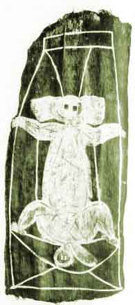 Fig. 81 [Bark Drawing: a Mormo, (Geimbio Tribe)] represents a different type of spirit. This one belongs to the Geimbio tribe and is supposed to fly about in the daylight or moonlight but not on dark nights. It lives amongst the bamboo trees, hanging on to special ropes made out of banyan-bark string, called
