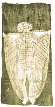 Fig. 83 [Bark Drawing: a Mormo, Called Warraguk, (Kakadu Tribe)] represents a very special spirit which was first seen by a medicine man named Mitjuombo. It is called Warraguk and is supposed to walk about in the day time, searching for mormo, or sugar bag. When at rest it lives in the bamboos and paper bark trees, on to which it hangs like a bat. Also it has flaps of skin running on each side of its body from the arms to the legs, by means of which it flies. Its general form has certainly been suggested by that of the "flying-fox," a large bat that is very commonly met with in the jungle along the river flats in the Kakadu country.