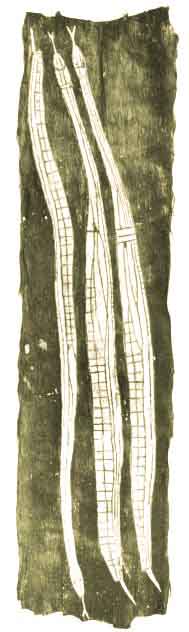 Fig. 84 [Bark Drawing: Three Snakes, (Kakadu Tribe)] represents three snakes, the two left hand ones being Narenma and the right hand, Ngabadaua, a snake that figures largely in the traditions of the Kakadu.