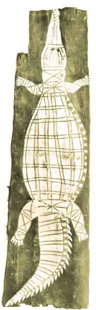 Fig. 85 [Bark Drawing: Crocodile, (Kakadu Tribe)] is a drawing of an Eribinjori, or large crocodile. Behind the two jaws are the eyes, and behind them is the tongue, or nainjil; then follows the neck, or munganumo, which is succeeded by the shoulder, or mundambir, from which the front limbs project. The trunk and tail are remarkable because they are drawn, as it were, in profile so as to show the backbone running along the right side, the scales on the under surface being also indicated. The pelvic region, called parda, is marked by cross lines and has the hind limbs arising from it, and along the right side of the tail the dorsal row of spines is drawn, with the backbone below them.