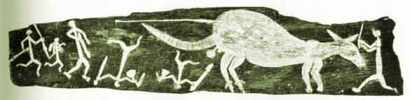 digging stick in her hand and a dilly bag hanging from her head. Behind her is a man, evidently following the chase with a spear in his left hand and a spear-thrower in his right. In front of the kangaroo is the figure of a man who is supposed to be killing the wounded animal with a club.