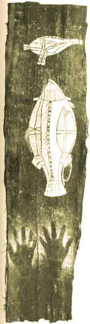 Split feathers of white cockatoo and brown owl were fastened between the square ends, the only other decoration consisting of a circle of wax on each side covered with abrus seed. This was one of the very few examples in which the surface of the bark was left in its natural state, no colour design of any kind being drawn on it.