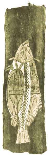Fig. 89 [Bark Drawing: Barramunda Fish, (Kakadu Tribe)] represents a Kimberikara or Barramunda fish (Osteoglossum leichardti). Along the back a line of tjali, or flesh, is indicated; below this there is the backbone, and below this again the internal organs.
