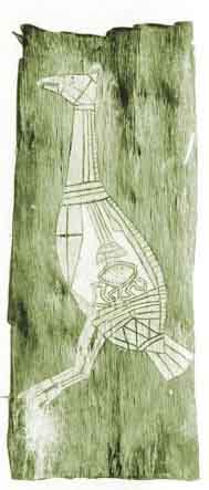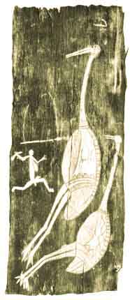 Fig. 90 [Bark Drawing: Native Spearing 'Native Companion', (Kakadu Tribe)] is a drawing of a Jimeribunna, or native companion (Grus australasianus) which has been speared by a native. The relative proportions of the bird are well shown and its internal anatomy indicated.