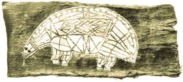Fig. 92 [Bark Drawing: Echidna, (Kakadu Tribe)] Is one of the best of the animal drawings. It represents an Echidna, or erleringerlura. The strong, compact body, with short legs, is very well expressed, and there is no mistaking its identity.