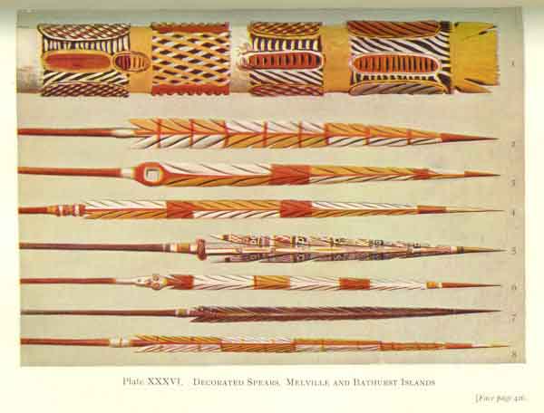 Plate XXXVI. [Decorated Spears, Melville and Bathurst Islands.] serves to give some idea of the really extraordinary and varied decorations on the Melville Island clubs and spears. Much as they vary in detail, they may really be divided so far as decoration is concerned into three main groups, first, those in which the surface is blackened (Plate XXXVI., Figs. 5 and 7), and a design of lines, circles, and dots drawn on this; second, those in which the surface is not blackened, and the design takes the form of a successive series of colour bands; third, those in which the colours alternate from side to side.