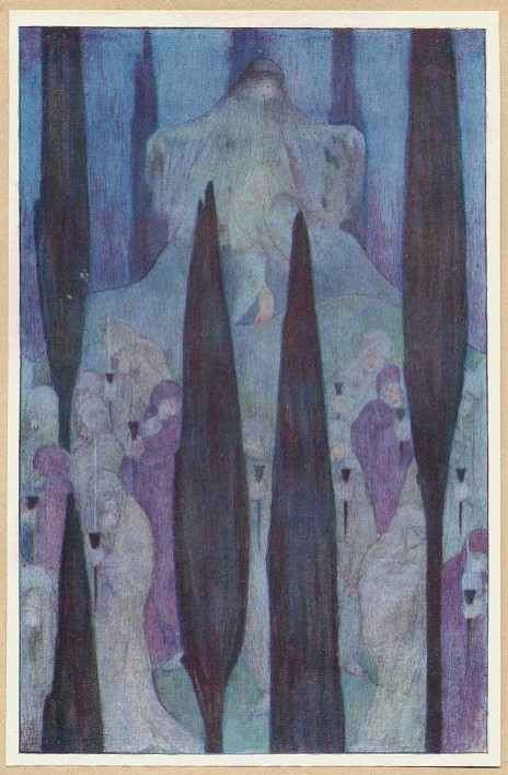 Then she desired her husband more and more, assuring him that she should die, unless he would grant that she might see her sisters, whereby she might speak with them and comfort them; whereat at length he was contented, and moreover he willed that she should give them as much gold and jewels as she would. But he gave her a further charge, saying: "Beware that ye covet not, being moved by the pernicious counsel of your sisters, to see the shape of my person, lest by your curiosity you be deprived of so great and worthy estate."