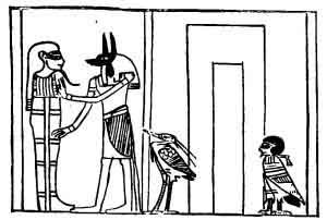 the body; the picture of the deceased walking away from a "block of slaughter" and a knife dripping with blood suggests escape from a cruel death; the picture of a soul and spirit standing before an open door suggests that the soul has freedom to wander about at will; and the picture of the soul and the shadow in the act of passing out through the door of the tomb indicates clearly that these parts of man's economy are
