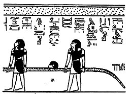 The Boat of Ra being towed through the Seventh Division of the Tuat by the gods thereof.