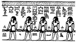 3. An upright, bearded mummied form called QAN. To the neck of this figure are attached two ropes, which are twisted together symmetrically, and are grasped by twelve bearded men with both hands. Each god stands within a loop formed by the two ropes, and has a star before him. The gods are described as "those who hold the rope which cometh forth . . . . . . . ."