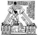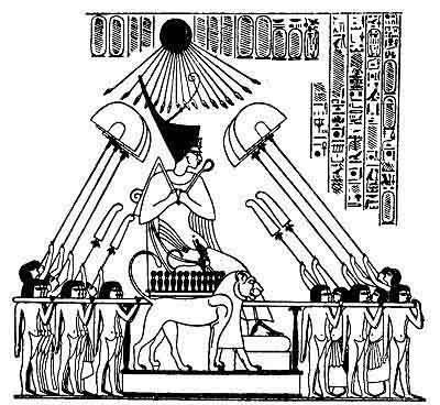 Amenhetep IV seated on his portable lion-throne beneath the rays of Aten; he holds in his hands the old Pharaonic symbols of sovereignty