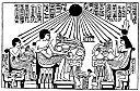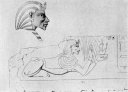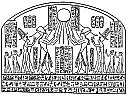 Amenhetep IV and his Queen Nefertiti and some of the daughters seated with the rays of Aten falling upon them. The queen wears the disk, horns and plumes of Hathor and Isis. The abnormal development of the lower part of the body seems to be a characteristic of every member of the royal family.