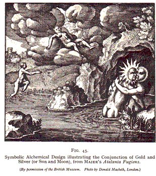 In view of the astrological symbolism of these metals, that gold should be masculine, silver feminine, does not surprise us, because the idea of the masculinity of the sun and the femininity of the moon is a bit of phallicism that still remains with us. It was by the marriage of gold and silver that very many alchemists considered that the magnum opus was to be achieved. Writes BERNARD of TREVISAN: "The subject of this admired Science [alchemy] is Sol and Luna, or rather Male and Female, the Male is hot and dry, the Female cold and moyst." The aim of the work, he tells us, is the extraction of the spirit of gold, which alone can enter into bodies and tinge them. Both Sol and Luna are absolutely necessary, and "whoever . . . shall think that a Tincture can be made without these two Bodyes,