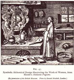 shown working in conjunction with a woman. We are reminded of NICOLAS FLAMEL (1330-1418), who is reputed to have achieved the magnum opus together with his wife PERNELLE, as well as of the many other women workers in the Art of whom we read. It would be of interest in this connection to know exactly what association of ideas was present in the mind of MICHAEL MAIER when he commanded the alchemist: "Perform a work of women on the molten white lead, that is, cook,"[1] and illustrated his behest with a picture of a pregnant woman watching a fire over which is suspended a cauldron and on which are three jars. There is a cat in the background, and a tub containing two fish in the foreground, the whole forming a very curious collection of emblems. Mr WAITE, who has dealt with some of these matters, luminously, though briefly, says: "The evidences with which we have been dealing concern solely the physical work of alchemy and there is nothing of its mystical aspects. The Mutus Liber is undoubtedly on the literal side of metallic transmutation; the memorials of Nicholas Flamel are also on that side," etc. He adds, however, that "It is on record that an unknown master testified to his possession of the mystery, but he added that he had not proceeded to the work because he had failed to meet with an elect woman who was necessary thereto"; and proceeds to say: "I suppose that the statement will awaken in most minds only a vague sense of wonder, and I can merely indicate in a few general words that which I see behind it. Those Hermetic texts which bear a spiritual interpretation