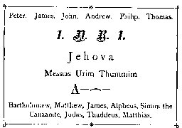 5. You must wear a breastplate of parchment, ten inches high and ten inches wide, inscribed with the names of the twelve apostles with the five-fold name of Schemhamforasch, in the same order that it is placed on the last leaf.