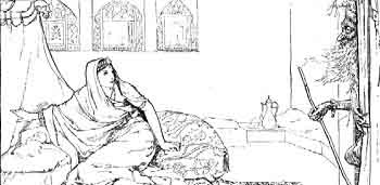 "Only one thing can save my life, but I know you will not 'do it." He replied, "Yes, whatever it is, I will do it." She then said, "To save my life, you must kill the seven daughters of your first wife, and put some of their blood on my forehead and on the palms of my hands, and their death will be my life." At these words the Raja was very sorrowful; but because he feared to break his word, he went out with a heavy heart to find his daughters.