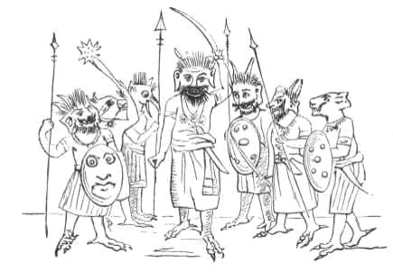 Now, not far from them was a lofty building, which looked exactly like a fine temple. The Deaf Man saw it, and he and the Blind Man resolved to spend the night there; and, having reached the place, they went in and shut the door, taking the donkey and the great big chattee with them. But this building, which they mistook for a temple, was in truth no temple at all, but the house of a very powerful Rakshas; and hardly had the Blind Man, the Deaf Man, and the donkey got inside, and fastened the door, than the Rakshas, who had been out, returned home. To his surprise he found the door fastened, and heard people moving about inside his house. 'Ho! ho!' cried he to himself, 'some men have got in here, have they? I'll soon make mince-meat of them!' So he began to roar in a voice louder than the thunder, crying, 'Let me into my house this minute, you wretches! let me in, let me in, I say!' and to kick the door and batter it with his great fists. But though his voice was very powerful, his appearance was still more alarming, insomuch that the Deaf Man, who was peeping at him through a chink in the wall, felt so frightened that he did not know what to do. But the Blind Man was very brave (because he couldn't see), and went up to the door, and called out, 'Who are you? and what do you mean by coming battering at the door in this way, and at this time of night?'