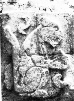 a and b, Puma and squirrel from the frieze of the Temple of the Warriors at Chichen Itzá. c, The four trees and birds set at the cardinal points to commemorate the previous destruction of the world. Sculptured panel of the Temple of the Wall Panels at Chichen Itzá. (After Ruppert.)