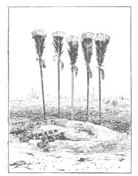 124. LAST NIGHT. Just after sunset the old chanter posted himself some paces to the east of the great woodpile, on the spot where the gate of the corral was to be, and began a song. Simultaneous with the beginning of the song was the commencement of the building of the dark circle. All the young and middleaged men in camp assisted. They dragged the branches from where they had been cut down in the neighboring woods and put them in position in the circle with great celerity. The work was all done in less than an hour, during which time the chanter ceased not for an instant his song and rattle. When the fence was finished to his satisfaction he stopped his song and the labors of the workmen ceased with the sound. When finished the corral averaged
