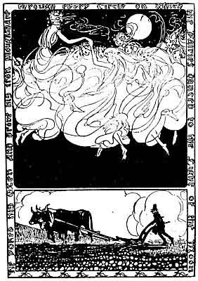 The farmer took her advice. He yoked his oxen and drove his iron ploughshare through every circle in which the fairies had danced at night, and sowed it with corn. The nightly sounds of dance and song ceased, and no fairy was afterwards seen in the fields of Pantannas.