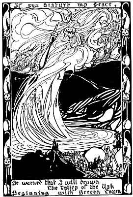 Some hundreds of years after, the inhabitants of the neighbourhood formed a plan of draining the lake to see whether the fairies had left any treasure at the bottom of it. They assembled at the lake one day in considerable numbers with spades and pickaxes, and set to work with such vigour that in a few hours they had dug a trench thirty yards in depth (the remains of it may still be seen). At last they had got so near the mere that it seemed as if another blow of the pickaxe would break through the bank and let out the water. Just as this blow was going to be given, just as the pickaxe was lifted up to complete the undertaking, a flash of lightning was seen which averted the blow; the sky became black, a loud peal of thunder rolled among the mountains, waking their thousand echoes, and all the workmen ran from the trench and stood in awe upon the brink of the lake. As the sound of the thunder died away, a sort of ripple was perceived on the face of the water, and the centre of the lake became violently agitated. From this boiling eddy was seen to arise a figure of gigantic stature, whose hair and beard were at least three yards in length. Standing nearly half out of the water, he addressed the workmen: