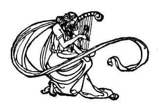 One day, among the company who had come to see if the stories about the harp were true, was the bard who had made such unpleasant remarks about Morgan's singing. Morgan determined to pay him out, and instead of stopping as usual after the dance had been going on for a few minutes, he kept on playing. He played on and on until the dancers were exhausted and shouted to him to stop. But Morgan was finding the scene much too amusing to want to stop. He laughed until his sides ached and the tears rolled down his cheeks at the antics of his visitors, and especially at those of the bard. The longer he played the madder became the dance: the dancers spun round and round, wildly knocking over the furniture, and some of them bounded up against the roof of the cottage till their heads cracked again. Morgan did not stop until the bard had broken his legs and the rest had been jolted almost to pieces. By that time his revenge was satisfied, and his sides and jaws were so tired with laughing that he had to take his fingers away from the strings.