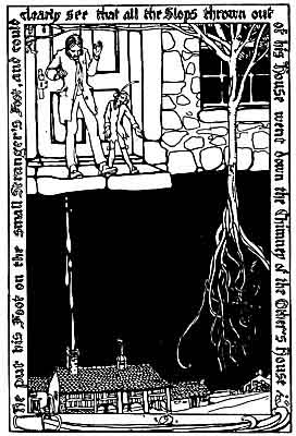 One night before going to bed he was standing a few steps in front of his house, meditating over his trouble. "I cannot imagine why the cattle do not get better," said he out loud to himself. "I will tell you," said a squeaky little voice close by him. The farmer turned in the direction of the sound and saw a tiny little man, looking very angrily at him. "It is," continued the mannikin, "because your family keeps on annoying mine so much." "How is that?" asked the farmer, surprised and puzzled. "They are always throwing the slops from your house down the chimney of my house," said the little man. "That cannot be," retorted the farmer, "there is no house within a mile of mine." "Put your foot on mine," said the small stranger, "and you will see that what I say is true." The farmer complying, put his foot on the other's foot, and he could clearly see that all the slops thrown out of his house went down the chimney of the other's house which stood far below in a street he had never seen before. Directly he took his foot off the other's, however, there was no sign of house or chimney. "Well, indeed, I am very sorry," said the farmer. "What can I do to make up for the annoyance which my family has caused you?" The tiny little man was satisfied by the farmer's apology, and he said: "You had better wall up the door on this side of your house and make another in the other side. If you do that, your slops will no longer be a nuisance to my family and myself." Having said this he vanished in the dusk of the night.