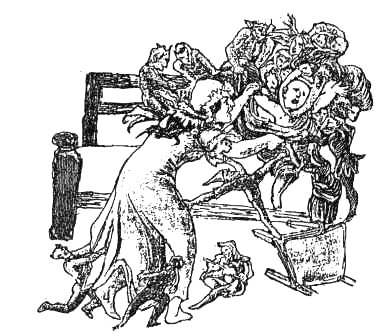 This class of story is not always confined to the case of the plentyn-newid, as I have said. It is applied to the household fairy, when the latter, as in the following in stance, appears to have brought a number of extremely noisy friends and acquaintances to share his shelter. Dewi Dal was a farmer, whose house was over-run with fairies, so that he could not sleep of nights for the noise they made. Dewi consulted a wise man of Taiar, who entrusted Dewi's wife to do certain things, which she did carefully, as follows: 'It was the commencement of oat harvest, when Cae Mawr, or the big field, which it took fifteen men to mow in a day, was ripe for the harvesters. "I will prepare food for the fifteen men who are going to mow Cae Mawr tomorrow," said Eurwallt, the wife, aloud. "Yes, do," replied Dewi, also aloud, so that the fairies might hear, "and see that the food is substantial and sufficient for the hard work before them." Said Eurwallt, "The fifteen men shall have no reason to complain upon that score. They shall be fed according to our means." Then when evening was come Eurwallt prepared food for the harvesters' sustenance upon the following day. Having procured a sparrow, she trussed it like a fowl, and roasted it by the kitchen lire. She then placed some salt in a nutshell, and set the sparrow and the salt, with a small piece of bread, upon the table, ready for the fifteen men's support while mowing Cae Mawr. So when the fairies beheld the scanty provision made for so many men, they said "Let us quickly depart from this place, for alas the means of our hosts are exhausted. Who before this was ever so reduced in circumstances as to serve up a sparrow for the day's food of fifteen men?" So they departed upon that very night. And Dewi Dal and his family lived, ever afterwards, in comfort and peace. [Rev. T. R. Lloyd (Estyn), in 'The Principality.']