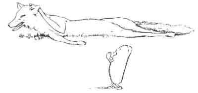 On went Johnny-cake, and by and by he came to a fox that lay quietly in a corner of the fence. The fox called out in a sharp voice, but without getting up: 'Where ye going, Johnnycake?'