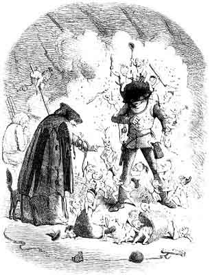Scarcely awake, he put up both: hands, and rubbed his eyes; and in doing so, to his extreme surprise, pushed off a little wretch who was sitting astride upon his nose kicking it for amusement, as if he had been laying his heels into the sides of a Pixy pony. My little gentleman was very dapper, being dressed in a green cloak and hood, very like a peas-cod; with a white cap, resembling a pea blossom, upon his head, altogether very trim and pretty. His face was gay and handsome; he wore moustachios on his upper lip; there as a free air about him, and a dash of the saucy fellow. His under clothes were tight to his shape; but with a little hole behind for the convenience of swinging carelessly his tail, which was curly and silky. The other Pixies were less striking, though still well looking, clothed and trimly dressed. They were all singing in their small squeaking way--