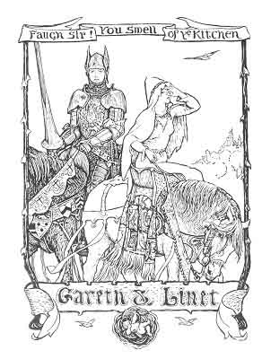 [paragraph continues] 'though he might have forced an entrance many a time, but he hoped that Sir Lancelot du Lake or Sir Tristram or Sir Gawaine should come to do battle with him.' 'My Lord Sir Persant of Inde,' said the damsel, 'I bid you knight this gentleman before he fight with the Red Knight.' 'That I will gladly,' replied Sir Persant, 'if it please him to take the order of knighthood from so simple a man as I am.' 'Sir,' answered Beaumains, 'I thank you for your goodwill, but at the beginning of this quest I was made a Knight by Sir Lancelot. My name is Sir Gareth of Orkney and Sir Gawaine is my brother, though neither he nor King Arthur, whose sister is my mother, knows of it. I pray you to keep it close also.'