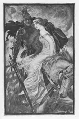 Now we come to the sorrowful tale of Lancelot and Guenevere, and of the death of King Arthur. Already it has been told that King Arthur had wedded Guenevere, the daughter of Leodegrance, King of Cornwall, a damsel who seemed made of all the flowers, so fair was she, and slender, and brilliant to look upon. And the Knights in her father's Court bowed down before her, and smote their hardest in the jousts where Guenevere was present, but none dared ask her in marriage till Arthur came. Like the rest he saw and loved her, but, unlike them, he was a King, and might lift his eyes even unto Guenevere. The maiden herself scarcely saw or spoke to him, but did her father's bidding in all things, and when he desired her to make everything ready to go clothed as beseemed a Princess to King Arthur's Court, her heart beat with joy at the sight of rich stuffs and shining jewels. Then one day there rode up to the Castle a band of horsemen sent by the King, to bring her to his Court, and at the head of them Sir Lancelot du Lake, friend of King Arthur, and winner of all the jousts and tournaments where Knights meet to gain honour. Day by day they rode together apart and he told her tales of gallant deeds done for love of beautiful ladies, and they passed under trees gay with the first green of spring, and over hyacinths covering the earth with sheets of blue, till at sunset they drew rein before the silken pavilion, with the banner of Uther Pendragon floating on the top. And Guenevere's heart went out to Lancelot before she knew.