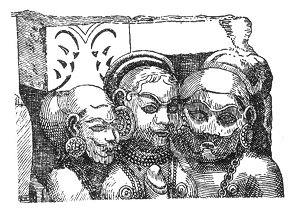 [paragraph continues] Oriental fragment, lately brought from the sacred caverns of Elephanta, near Bombay, a complete representation of the symbol so enigmatically expressed by the head above mentioned. These caverns are ancient places of worship, hewn in the solid rock with immense labour and difficulty. That from which the fragment in question was brought, is 130 feet long by 110 wide, adorned with columns and sculptures finished in a style very different from that of the Indian artists. 1 It is now neglected; but others of the same kind are still used as places of worship by the Hindoos, who can give no account of the antiquity of them, which must necessarily be very remote, for the Hindoos are a very ancient people; and yet the sculptures represent a race of men very unlike them, or any of the present inhabitants of India. A specimen of these was brought from the island of Elephanta, in the Cumberland man-of-war, and now belongs to the museum of Mr. Townley. It contains several figures, in very high relief; the principal of which are a man and woman, in an attitude which I shall not venture to describe, but only observe, that the action, which I have supposed to be a symbol of refreshment and invigoration, is mutually applied by both to their respective organs of