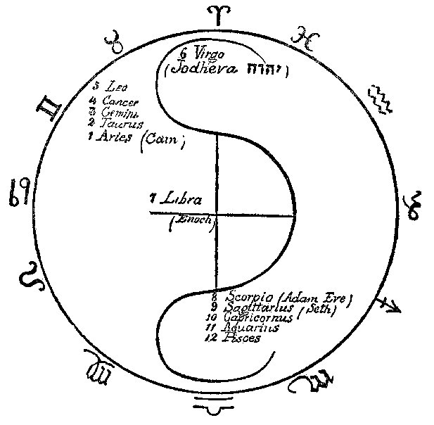 These additional signs of the Zodiac warrant us in saying that the Book of Genesis as we now find it, must be of later date than the invention of Libra by the Greeks; for we find the chapters of the genealogies remodelled to fit the new Zodiac, instead of the latter being made to correspond with the list of patriarchs. And it is this addition and the necessity of concealing the true key, that led the Rabbinical compilers to repeat the names of Enoch and Lamech twice, as we see them now in the Kenite table. Alone, among all the books of the Bible, Genesis belongs to an immense antiquity. The others are all later additions, the earliest of which appeared with Hilkiah, who evidently concocted it with the help of Huldah, the prophetess.